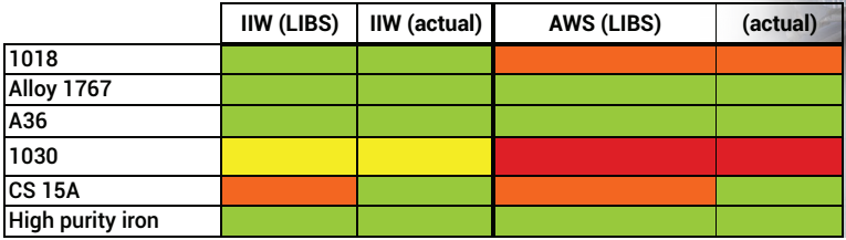 我們提供的Z系列LIBS(LIBZ)雷射導引光譜儀,已經證明其有能力測量低合金鋼和碳鋼的「碳當量」,和「碳含量」。碳分析方法,其需要5次的測量並平均之。對其它相同的合金元素也以相同的平均值,產出有意義的精準碳當量值。可焊性可透過LIBS(LIBZ)基於的公佈標準確定,類別「優秀的」和「非常好」被合併為一樣的層級。可焊性結果對於「國際焊接學會」跟「美國焊接學會」是可被接受的。